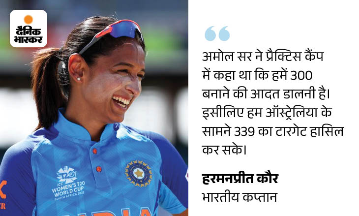 ऑस्ट्रेलिया को सेमीफाइल हराने के बाद हरमनप्रीत कौर ने पोस्ट मैच इंटरव्यू में बताया, टूर्नामेंट की तैयारी हमने 2 साल पहले ही शुरू कर दी थी। तभी हमने तय कर लिया था कि कौन सी प्लेइंग-11 होम कंडीशन में बेस्ट रहेगी। अमोल सर (कोच) ने टूर्नामेंट से पहले प्रैक्टिस मैच के दौरान भी कहा कि अगर हम लगातार 300 रन नहीं बनाएंगे तो वर्ल्ड कप नहीं जीत पाएंगे।