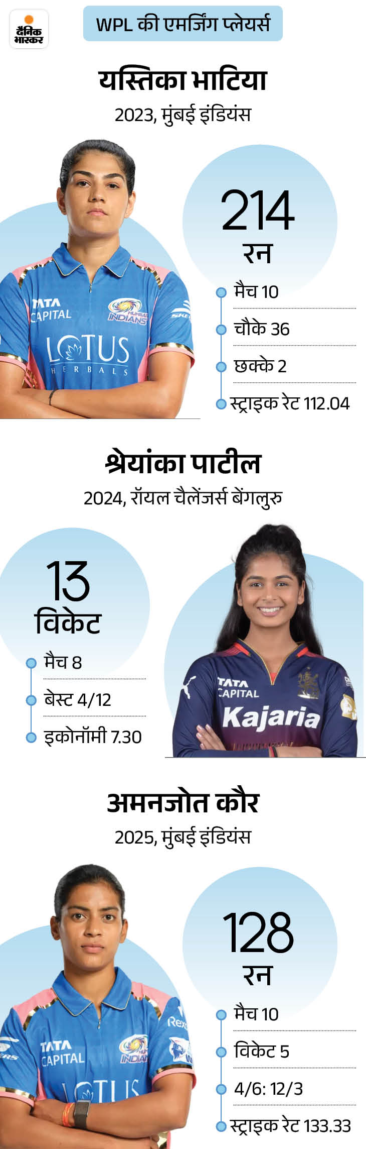 IPL ने जिस तरह मेंस टीम को जसप्रीत बुमराह, हार्दिक पंड्या, सूर्यकुमार यादव, अभिषेक शर्मा जैसे सितार दिए। उसी तरह WPL ने भारत को यास्तिका भाटिया, श्रेयांका पाटील, अमनजोत कौर, श्री चरणी, क्रांति गौड़ जैसी युवा और आक्रामक प्लेयर्स सौंपी। यास्तिका और श्रेयांका इंजरी के कारण वर्ल्ड कप का हिस्सा नहीं बन सकीं, लेकिन बाकी प्लेयर्स ने भारत को फाइनल में पहुंचाने में अहम योगदान दिया।