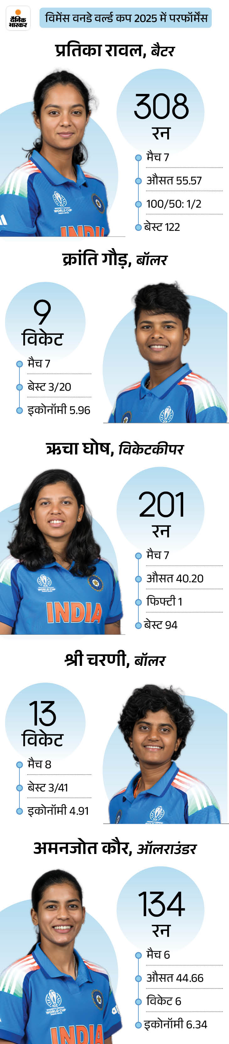 21 साल की लेफ्ट आर्म स्पिनर श्री चरणी, 22 साल की क्रांति गौड़, 25 साल की प्रतिका रावल, 22 साल की विकेटकीपर ऋचा घोष और अमनजोत कौर जैसी युवा प्लेयर्स ने वर्ल्ड कप में निडर मानसिकता दिखाई और टीम को अहम मैच जिताए। प्रतिका टूर्नामेंट में भारत की दूसरी टॉप स्कोरर रहीं, वहीं चरणी ने 13 विकेट हासिल किए।