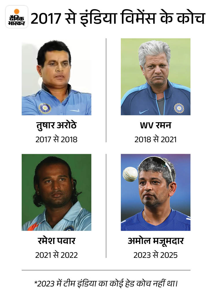 2017 में वर्ल्ड कप हारने के बाद इंडिया विमेंस ने 4 कोच बदले। इनमें WV रमन और रमेश पवार के बाद अमोल मजूमदार जैसे प्रोफेशनल शामिल हैं। मजूमदार को 2023 में हेड कोच बनाया गया, उन्होंने वनडे टीम को अटैकिंग माइंडसेट की आदत डलवाई।