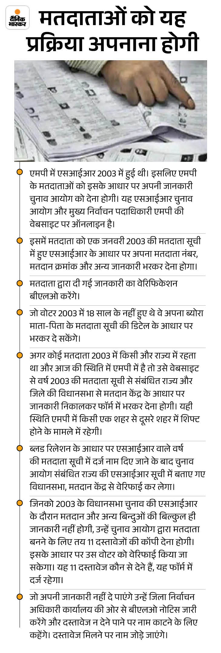 ऐसे होगा एसआईआर का काम चुनाव आयोग ने वर्ष 2002 से 2008 के बीच देश के सभी राज्यों की एसआईआर कराई है। इसका डेटा चुनाव आयोग की वेबसाइट के अलावा एमपी सीईओ की वेबसाइट पर उपलब्ध है। इसमें वोटर पूरी जानकारी भरकर एमपी में हुई 2003 की एसआईआर के आधार पर अपना मतदाता क्रमांक, मतदान केंद्र क्रमांक और अन्य जानकारी हासिल कर सकते हैं। यह जानकारी उन्हें बीएलओ द्वारा दिए गए फाॅर्म में भरकर देना होगी।