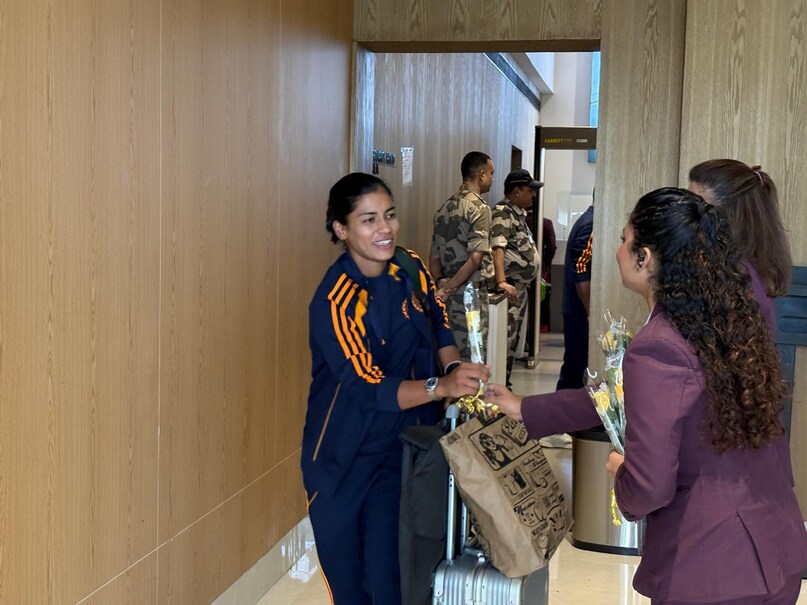 भारतीय महिला टीम की खिलाड़ी जब एयरपोर्ट पर पहुंचीं तो वह मौजूद लोगों में गजब का उत्साह देखने को मिला. एयरपोर्ट स्टाफ ने खिलाड़ियों को फूल देकर उनका स्वागत किया.