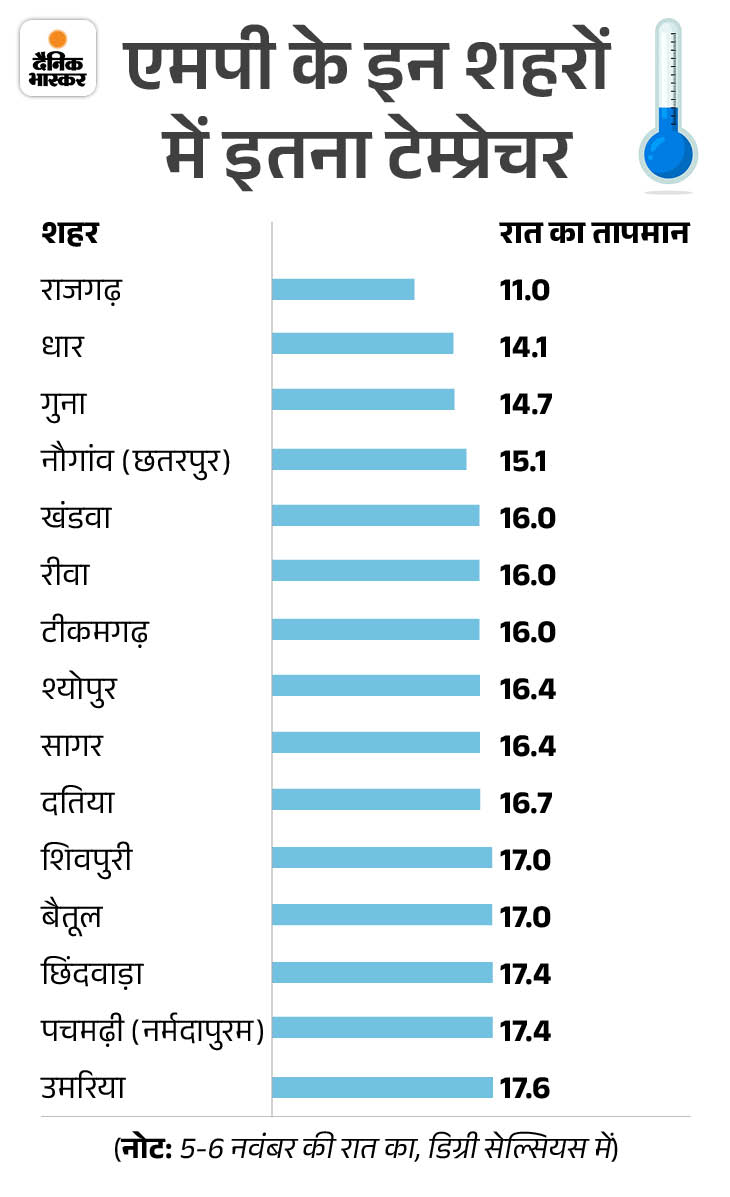 बुधवार-गुरुवार की रात से प्रदेश में ठंड का असर बढ़ गया। सभी शहरों में न्यूनतम तापमान 20 डिग्री से नीचे ही रहा। राजगढ़ में सबसे कम 11 डिग्री रहा। धार में 14.1 डिग्री, गुना में 14.7 डिग्री और नौगांव में पारा 15.1 डिग्री रहा।