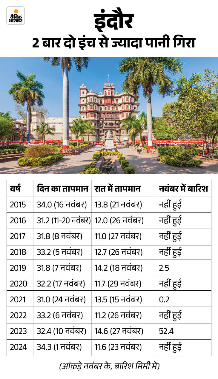 ग्वालियर: 1927 में 3 इंच पानी गिरा था पिछले 10 साल के आंकड़ों पर नजर डालें तो ग्वालियर में पारा 8 डिग्री तक पहुंच चुका है। 54 साल पहले वर्ष 1970 में टेम्प्रेचर 3 डिग्री तक पहुंच चुका है। यह ओवरऑल रिकॉर्ड है। 2 नवंबर 2001 को दिन का तापमान 37.3 डिग्री तक पहुंच चुका है, जबकि यह सामान्य तौर पर 33 से 35 डिग्री के बीच रहता है। इस महीने बारिश भी होती है। 1927 में पूरे महीने 3 इंच से ज्यादा पानी गिरा था। 10 साल में 3 बार ऐसा ही मौसम रह चुका है।