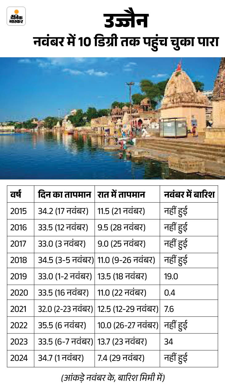 उज्जैन: न्यूनतम तापमान 10-11° के बीच रहता है यहां 30 नवंबर 1974 को रात का तापमान 2.8 डिग्री सेल्सियस पहुंच चुका है। यह ओवरऑल रिकॉर्ड है। वहीं, 6 नवंबर 2008 को दिन का तापमान 36.5 डिग्री रहा था। पिछले 10 साल की बात करें तो न्यूनतम तापमान 10-11 डिग्री के बीच रहा है, जबकि दिन में यह 33 से 35 डिग्री के बीच पहुंच चुका है।