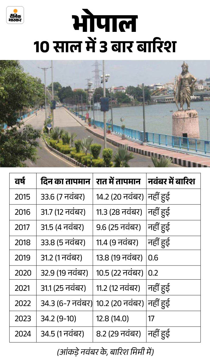 पिछले 10 साल से नवंबर में ठंड का ट्रेंड प्रदेश में नवंबर में पिछले 10 साल से ठंड के साथ बारिश का ट्रेंड भी है। अबकी बार भी ऐसा ही मौसम रहेगा। वहीं, बारिश के लिहाज से अक्टूबर का महीना उम्मीदों पर खरा उतरा है। औसत 2.8 इंच पानी गिर गया, जो सामान्य 1.3 इंच से 121% ज्यादा है।