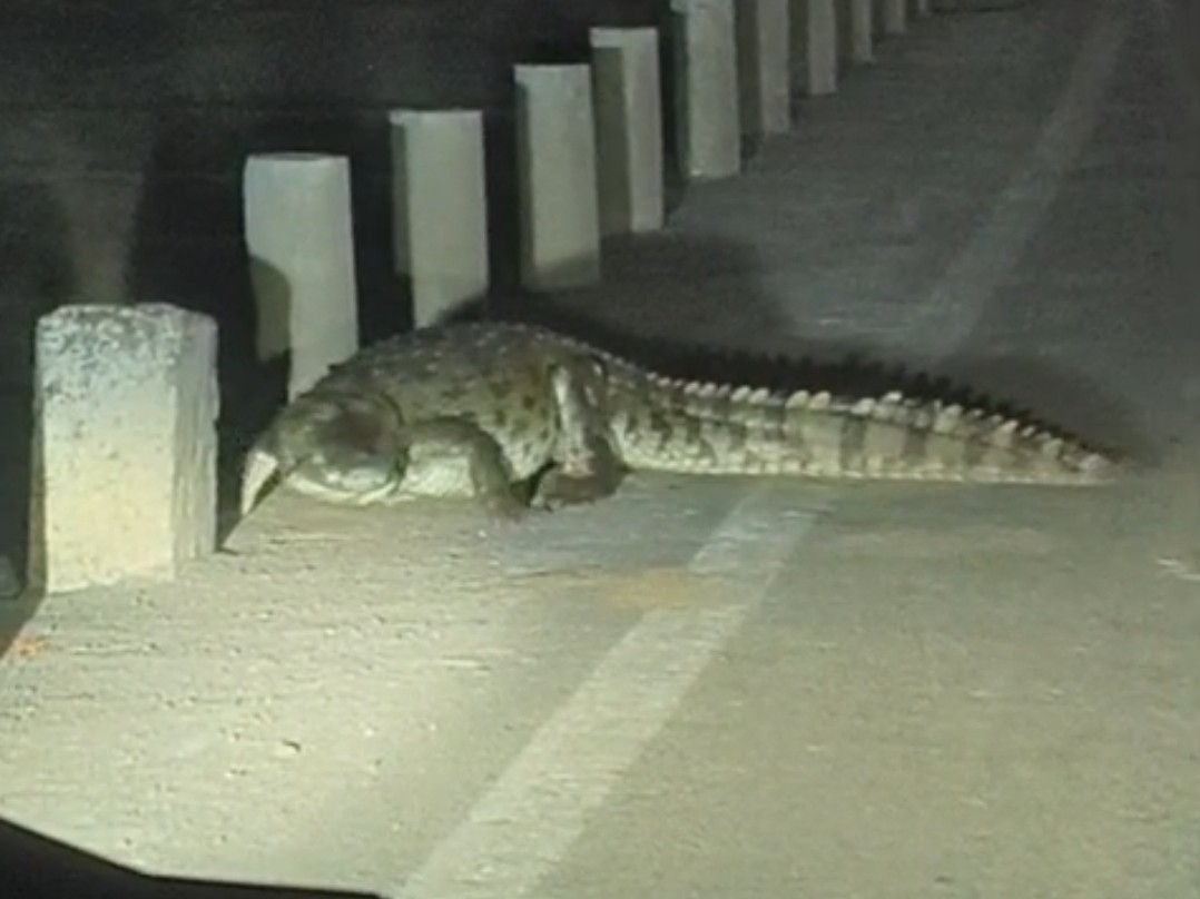 राह चलते एक व्यक्ति ने मगरमच्छ का टहलते हुए वीडियो अपने मोबाइल कैमरे में कैद कर लिया, जो अब सोशल मीडिया पर तेजी से वायरल हो रहा है। वीडियो में पुलिया के ऊपर मगरमच्छ को रेंगते हुए साफ देखा जा सकता है।
