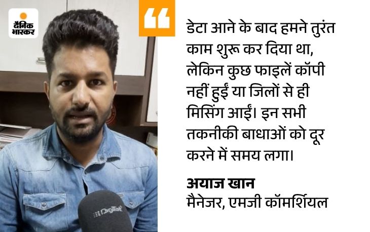 एमजी कॉमर्शियल के मैनेजर अयाज खान ने बताया कि देरी का मुख्य कारण डेटा ट्रांसफर में आई दिक्कतें थीं। कुछ जिलों से भेजी गई पीडीएफ फाइलें डाउनलोड हो रही थीं, तो कुछ नहीं हो रही थीं। डेटा अधूरा आ रहा था। इस समस्या से निपटने के लिए हमने अपने स्टाफ को प्रदेश के सभी जिलों में भेजकर पेन ड्राइव और हार्ड डिस्क के माध्यम से डेटा मंगवाया।