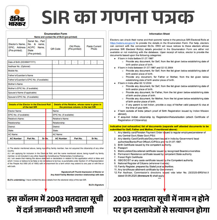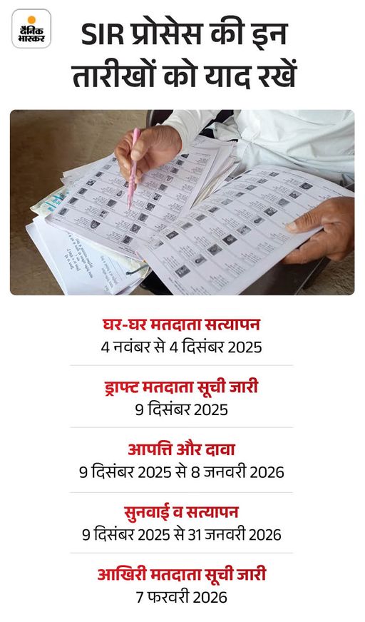 वोटर लिस्ट के स्पेशल इंटेंसिव रिवीजन यानी SIR की 103 दिन की प्रोसेस होगी। ये प्रोसेस अगले साल 7 फरवरी 2026 को खत्म होगी और इस दिन फाइनल वोटर लिस्ट जारी होगी। SIR की इस प्रोसेस का मकसद वोटर लिस्ट को पूरी तरह से अपडेट करना है। जिसमें फर्जी मतदाताओं के नाम हटाना, जिनकी मृत्यु हो चुकी है उनके नाम डिलीट करना, जो नाम छूट गए हैं उन नामों को जोड़ना है। इस प्रोसेस में बीएलओ घर-घर जाकर वोटर्स के नाम सत्यापित करेंगे। पूरी खबर पढ़ें…