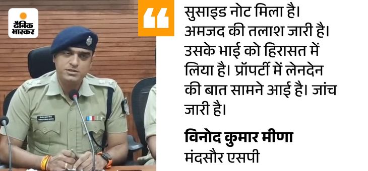 घटना जिले के सुवासरा में शुक्रवार की है। मृतक की पहचान मनीष व्यास (28) के रूप में हुई। मनीष ने सुसाइड नोट में भाजपा अल्पसंख्यक मोर्चा के जिला उपाध्यक्ष अमजद पठान को माफिया पठान बताया। कहा कि अमजद उधार लिए पैसे लौटाने की बजाया धमकियां देकर लगातार परेशान कर रहा है।