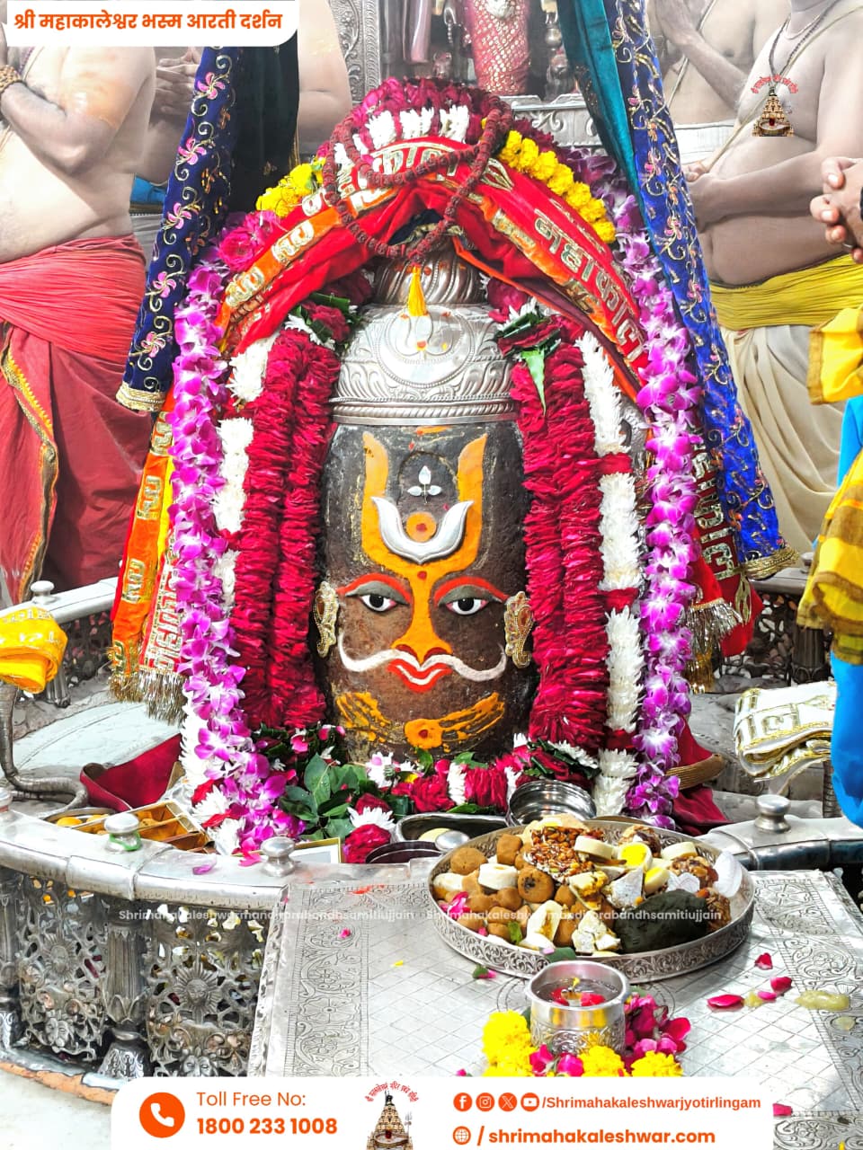 विश्व प्रसिद्ध श्री महाकालेश्वर मंदिर में रविवार तड़के भस्म आरती के दौरान भगवान महाकाल का रजत वैष्णव तिलक, बिल्वपत्र, फूलों की माला और आभूषणों से दिव्य श्रृंगार किया गया। सुबह चार बजे मंदिर के पट खोलने के बाद भगवान महाकाल का जलाभिषेक किया गया और दूध,