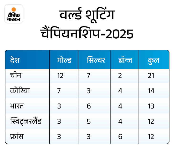 भारत तीन गोल्ड, छह सिल्वर और चार ब्रॉन्ज सहित कुल 13 मेडल के साथ तीसरे स्थान पर रहा। चीन पहले स्थान पर रहा। चीनी शूटर्स ने 12 स्वर्ण, सात रजत और दो कांस्य सहित कुल 21 पदक जीते। साउथ कोरिया ने सात स्वर्ण, तीन रजत और चार कांस्य पदक से दूसरा स्थान हासिल किया।