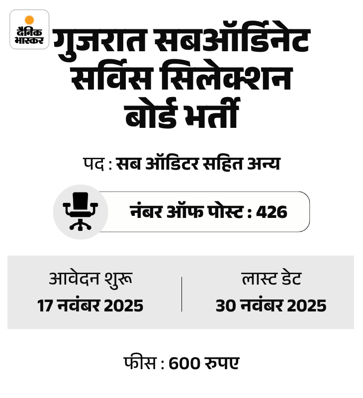 गुजरात सबऑर्डिनेट सर्विस सिलेक्शन बोर्ड ने 426 पदों पर आवेदन मांगे हैं। उम्मीदवार ऑफिशियल वेबसाइट gsssb.gujarat.gov.in पर जाकर अप्लाई कर सकते हैं।