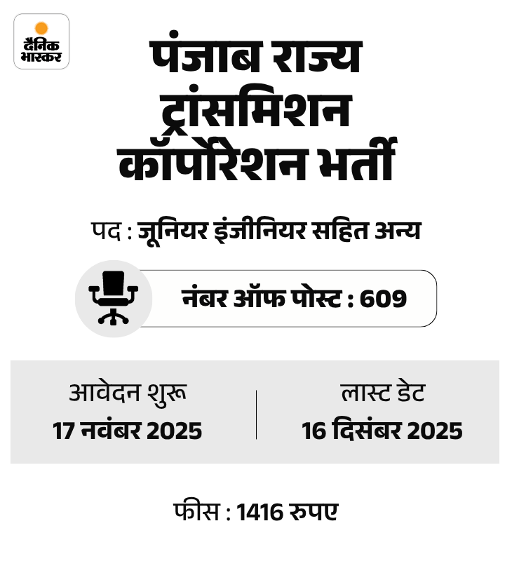 सरकारी नौकरी: पंजाब स्टेट पॉवर कॉर्पोरेशन में 609 पदों पर भर्ती; एज लिमिट 37 साल, सैलरी 47 हजार से ज्यादा