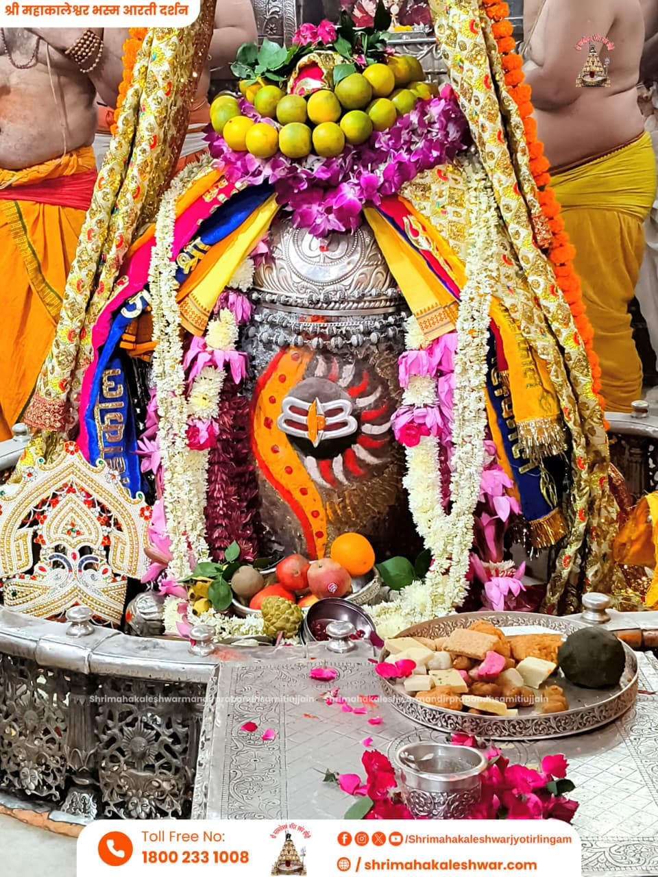 भगवान महाकाल का भांग, ड्रायफ्रूट, आभूषण और पुष्पों के साथ राजा स्वरूप में श्रृंगार किया गया। भस्म अर्पित करने के पश्चात शेषनाग का रजत मुकुट, रजत की मुण्डमाल और रुद्राक्ष की माला के साथ सुगंधित पुष्पों से बनी माला अर्पित की गई।गुलाब के सुगंधित पुष्प धारण किए भगवान महाकाल को फल और मिष्ठान का भोग लगाया गया।