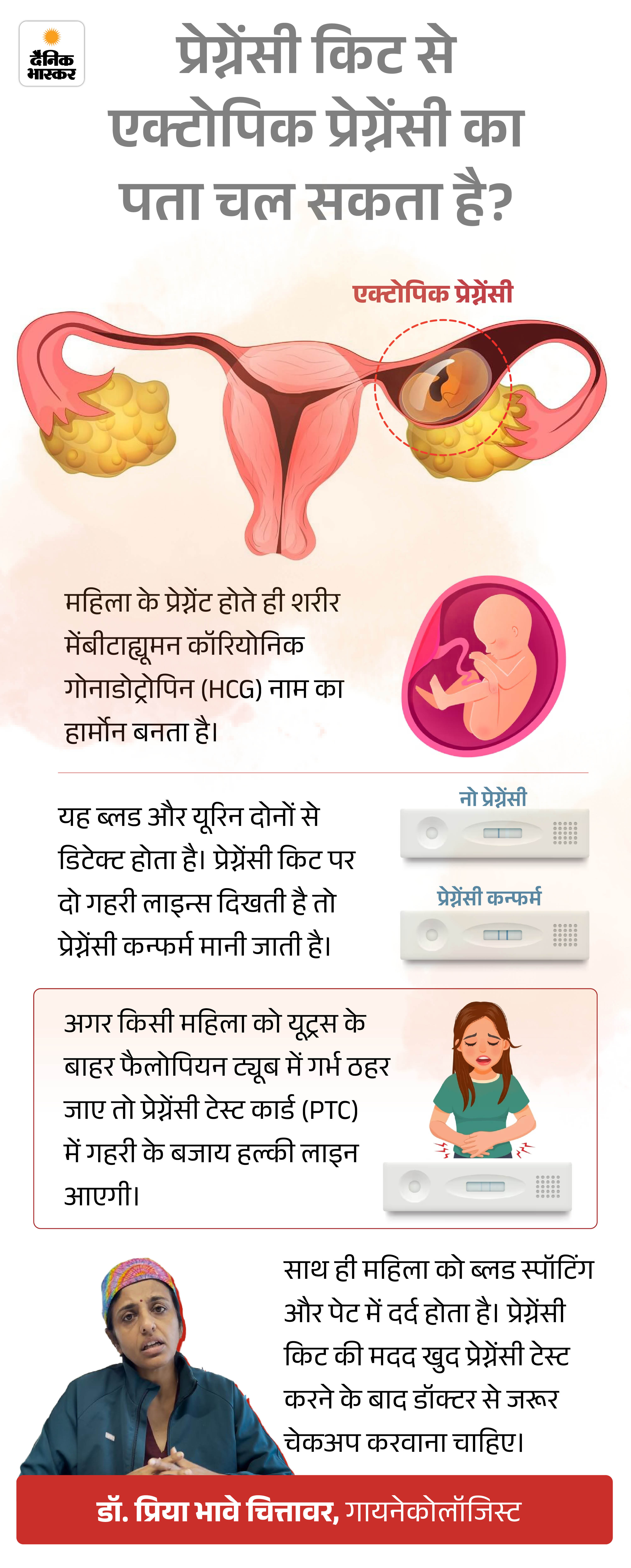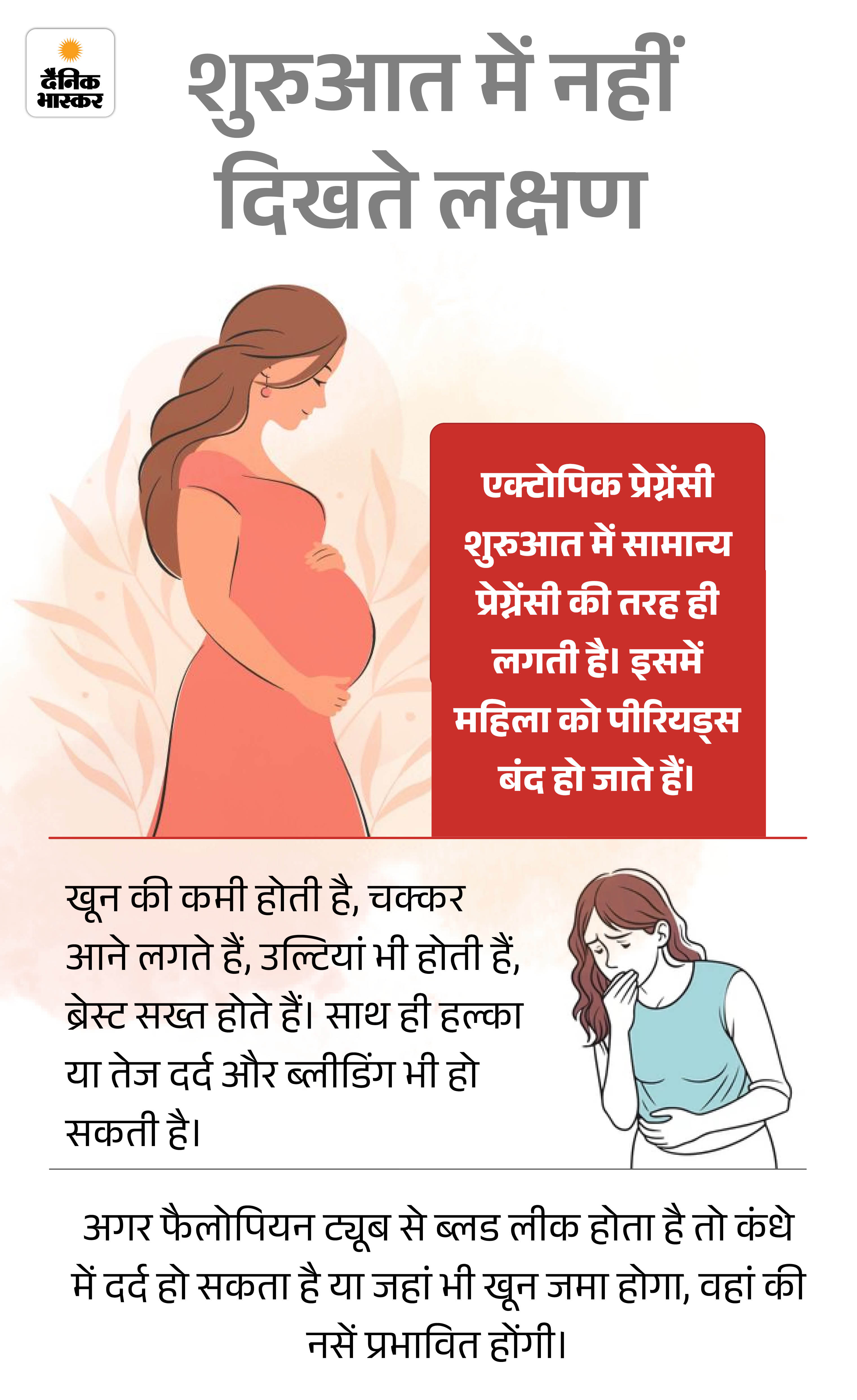 केस 3: जानकारी ने बचाई जान भोपाल की 26 साल की एक महिला को यह पता भी नहीं था कि वह गर्भवती हैं। उन्होंने सिर्फ अपने पीरियड मिस किए थे, लेकिन कुछ दिनों से उन्हें कमजोरी और लगातार चक्कर आने की शिकायत थी। डॉक्टर के पास जाने से पहले उन्होंने इसके बारे में स्टडी की। वहां उन्हें एक्टोपिक प्रेग्नेंसी के बारे में जानकारी मिली। उन्हें शक हुआ कि यह कोई सामान्य स्थिति नहीं है।