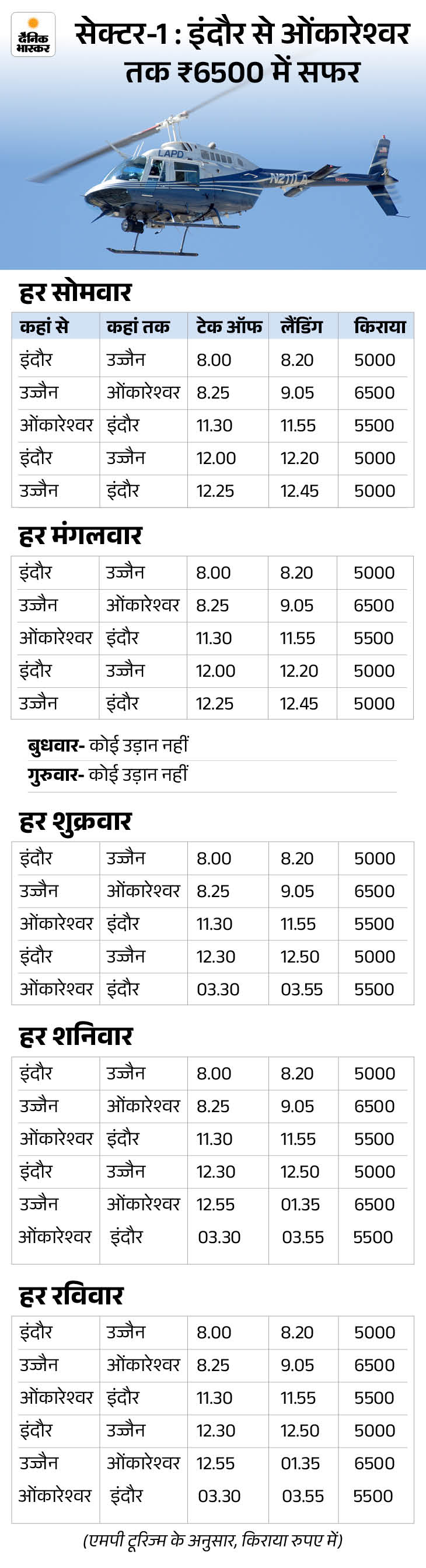सेक्टर-1 : इंदौर, उज्जैन और ओंकारेश्वर के बीच उड़ान इंदौर, उज्जैन, ओंकारेश्वर, मांडू, महेश्वर, गांधीसागर, मंदसौर, नीमच, हनुमंतिया, खंडवा, खरगोन, बुरहानपुर, बड़वानी, अलीराजपुर, रतलाम, झाबुआ, नलखेड़ा शामिल हैं। यानी, मालवा-निमाड़ का बेल्ट शामिल रहेगा। पहले फेज में इंदौर, उज्जैन और ओंकारेश्वर के बीच हेलिकॉप्टर की सप्ताह में 5 दिन नियमित उड़ान रहेगी। सबसे कम किराया 5 हजार तो सबसे ज्यादा साढ़े 6 हजार रुपए है।