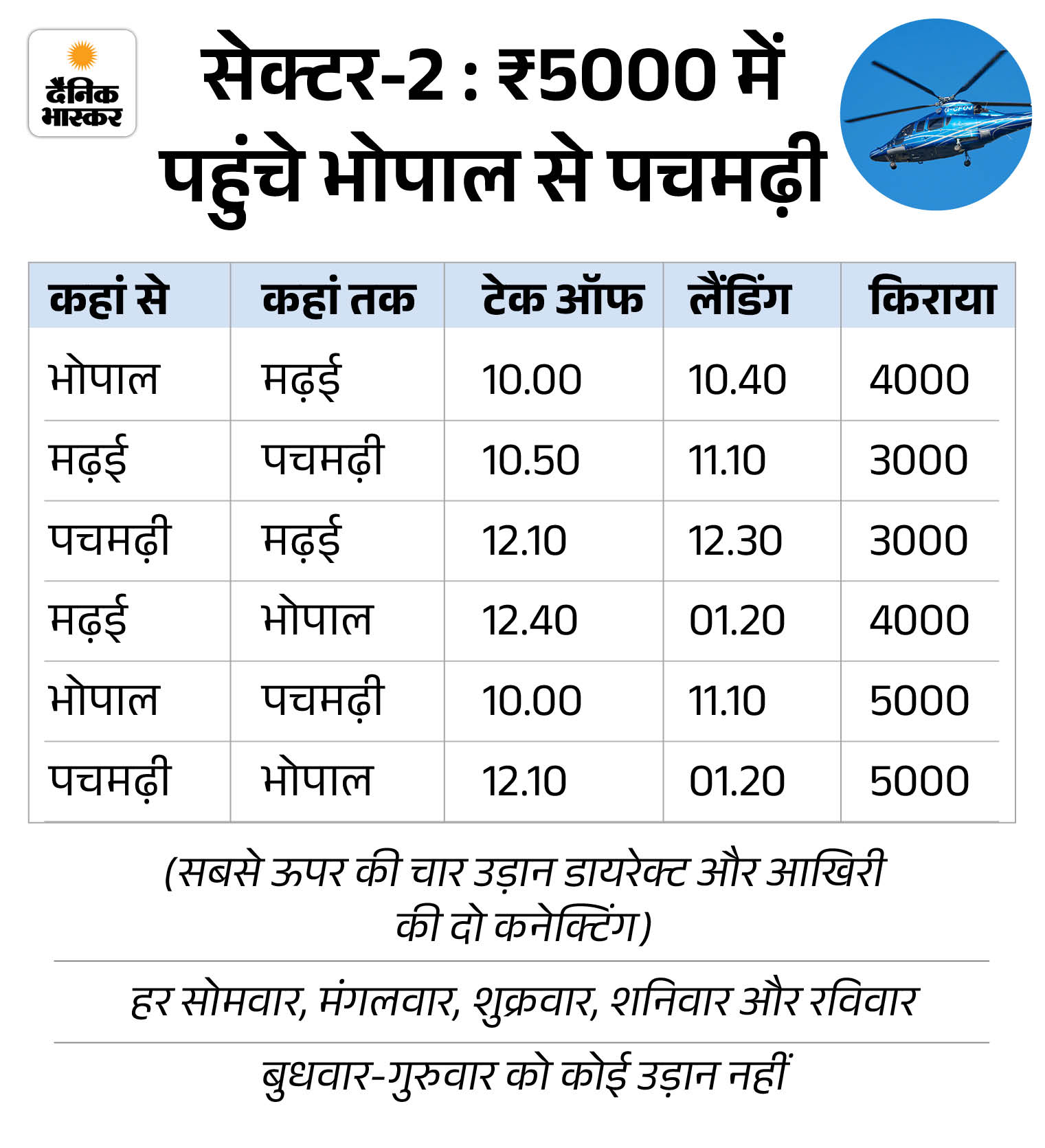 यहां दो तरह की उड़ानें रहेंगी। पहली डायरेक्ट और दूसरी कनेक्टिंग होगी। कनेक्टिंग भोपाल से पचमढ़ी के बीच ही होगी। न्यूनतम 3 हजार और अधिकतम 5 हजार रुपए किराया रहेगा।