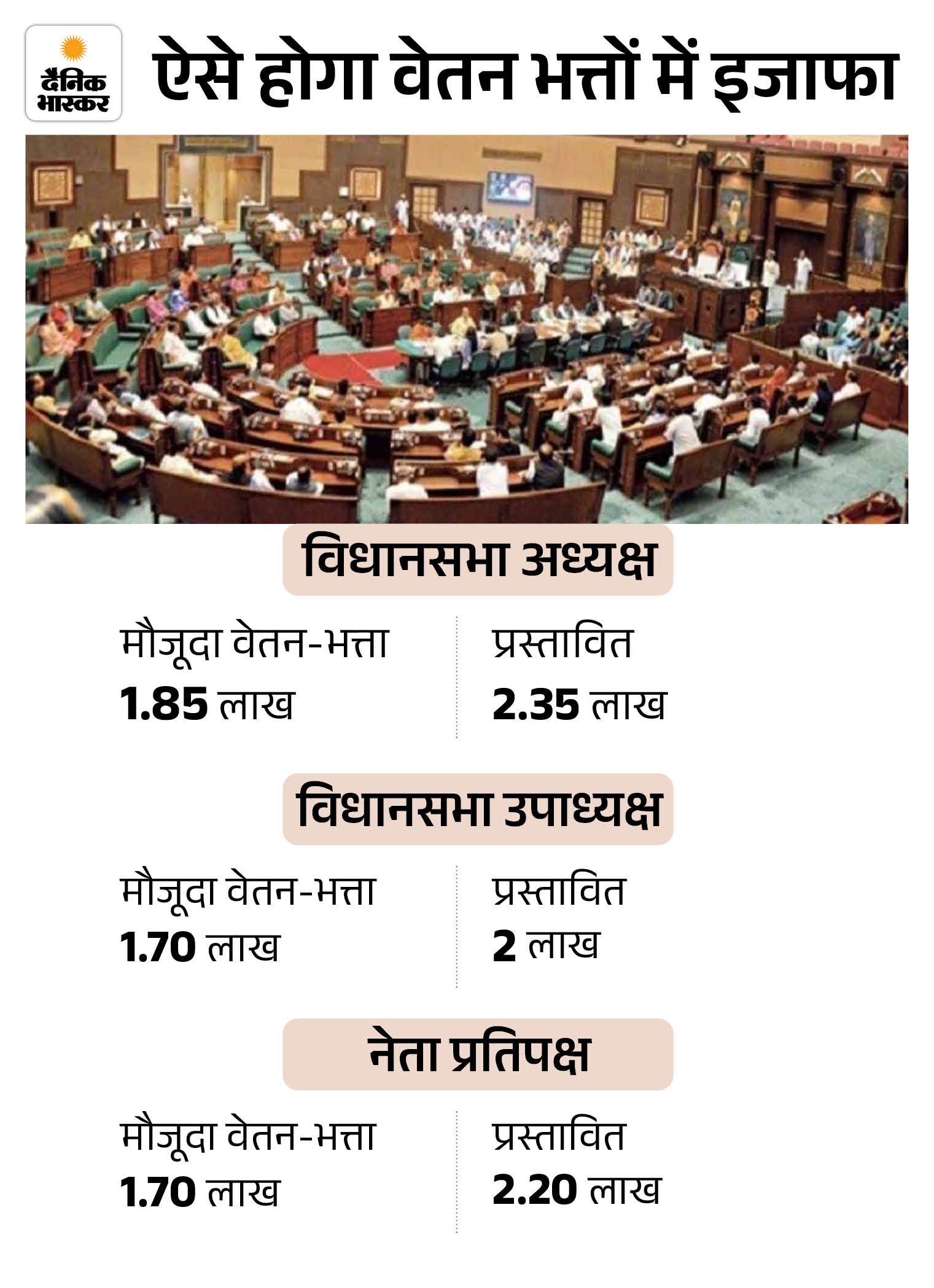 नेता प्रतिपक्ष का वेतन- भत्ता 2.20 लाख करने का प्रस्ताव नेता प्रतिपक्ष को हर महीने 45 हजार रुपए वेतन, 45 हजार रुपए सत्कार भत्ता, 35 हजार निर्वाचन क्षेत्र भत्ता, डेढ़ हजार रुपए प्रतिदिन दैनिक भत्ता दिया जाता है। इस प्रकार हर महीने 1 लाख 70 हजार रुपए मिलते है। अब इसमें 29 फीसदी की बढ़ोतरी करते हुए ये 2 लाख 20 हजार रुपए किए जाने का प्रस्ताव है।