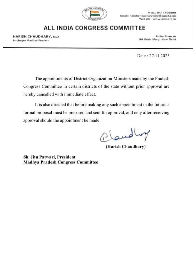 हरीश चौधरी का पत्र पढ़िए… जीतू पटवारी को भेजे पत्र में प्रदेश प्रभारी हरीश चौधरी ने लिखा- राज्य के कुछ जिलों में प्रदेश कांग्रेस कमेटी द्वारा पूर्व अनुमति के बिना किए गए जिला संगठन मंत्रियों के नियुक्तियों को तत्काल प्रभाव से रद्द किया जाता है।