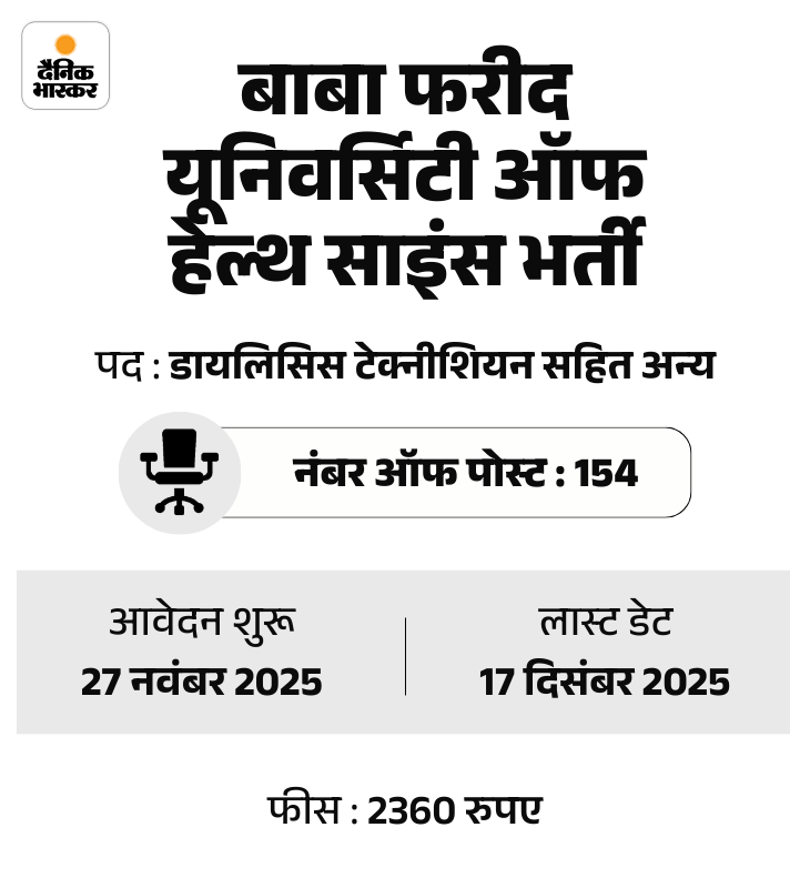 बाबा फरीद यूनिवर्सिटी ऑफ हेल्थ साइंस में 154 पदों पर भर्ती निकली है। उम्मीदवार ऑफिशियल वेबसाइट bfuhs.ac.in पर जाकर आवेदन कर सकते हैं।