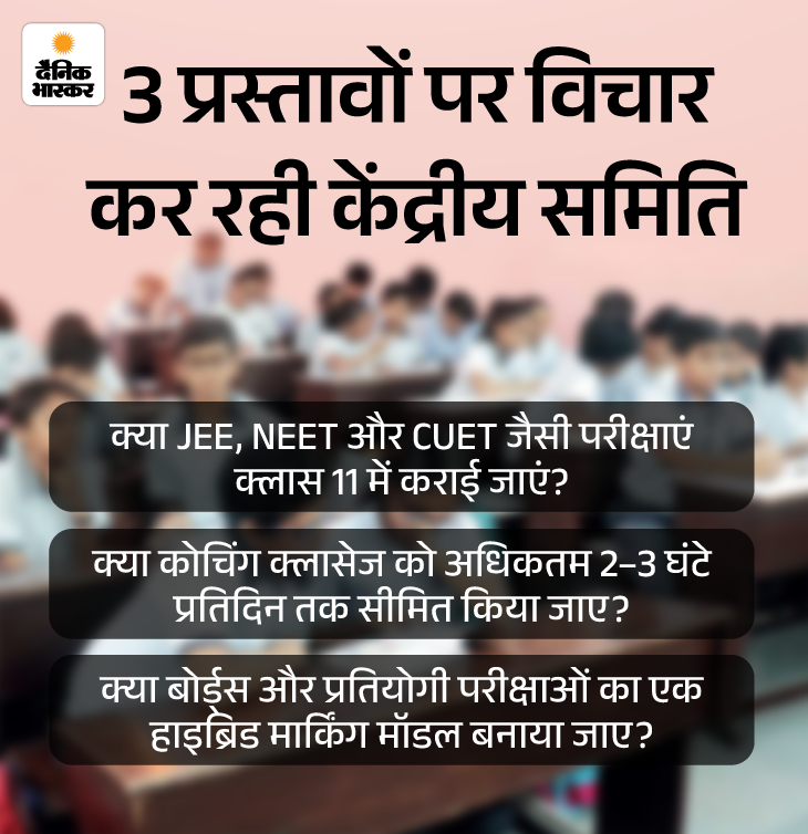 एक सेंट्रल पैनल को इसका जिम्मा सौंपा गया था, जो व्यापक सुधारों पर विचार कर रहा है। पैनल के सुझावों में क्लास 11 में ही NEET-JEE आयोजित करना, कोचिंग के रोज के घंटों को घटाकर 2-3 घंटे करना और बोर्ड परीक्षा के साथ NEET-JEE टेस्ट को मिलाकर एक हाइब्रिड मार्किंग मॉडल शामिल है।