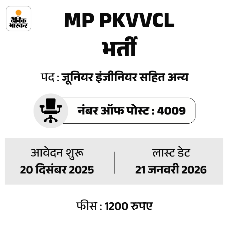 मध्यप्रदेश पश्चिम क्षेत्र विद्युत वितरण कंपनी लिमिटेड ने 4009 पदों पर भर्ती निकली है। 40 साल तक के 12वीं पास कैंडिडेट्स 21 जनवरी तक इसमें आवेदन कर सकते हैं।