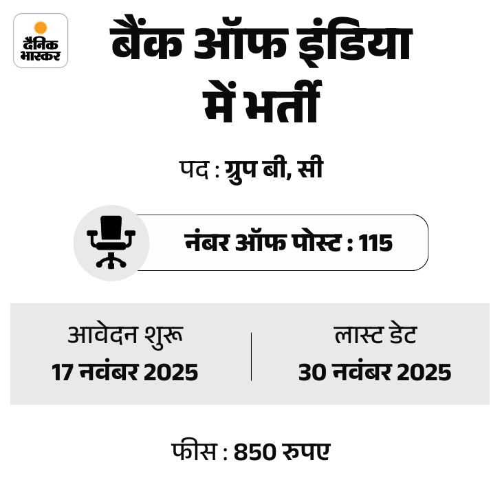 बैंक ऑफ इंडिया में स्पेशलिस्ट ऑफिसर के 115 पदों पर आवेदन की कल लास्ट डेट है। 45 साल तक के ग्रेजुएट्स कैंडिडेट्स 30 नवंबर तक इसमें आवेदन कर सकते हैं।
