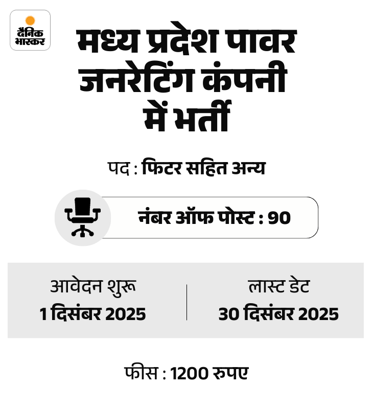 मध्यप्रदेश पावर जनरेटिंग कंपनी ने 90 पदों पर भर्ती का नोटिफिकेशन जारी किया है। इस भर्ती के लिए आवेदन प्रक्रिया 17 अक्टूबर से शुरू हुई थी। 30 दिसंबर आवेदन की लास्ट डेट है।
