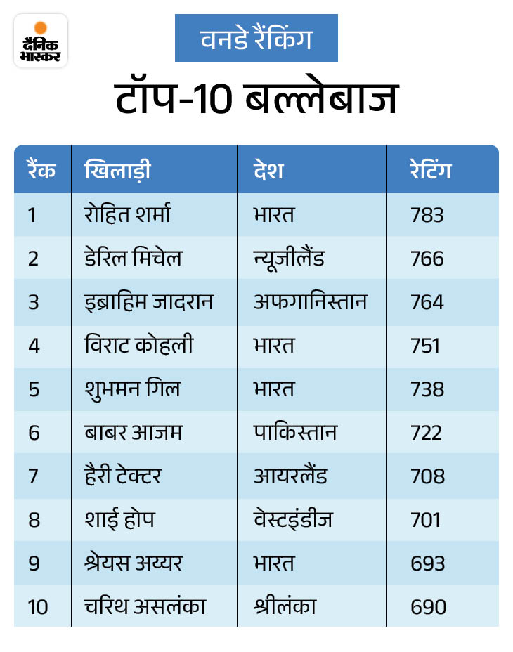 रोहित 783 रेटिंग पॉइंट्स के साथ पहले नंबर पर हैं। उन्होंने रांची में 57 रन बनाए थे। रायपुर में खेले जा रहे दूसरे वनडे में रोहित 14 ही रन बनाकर आउट हो गए।