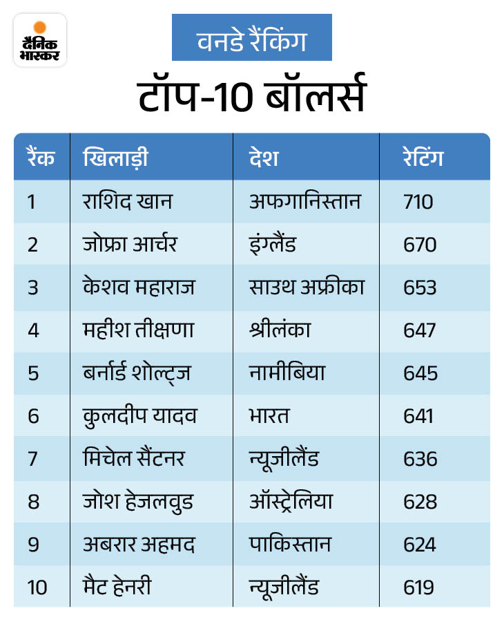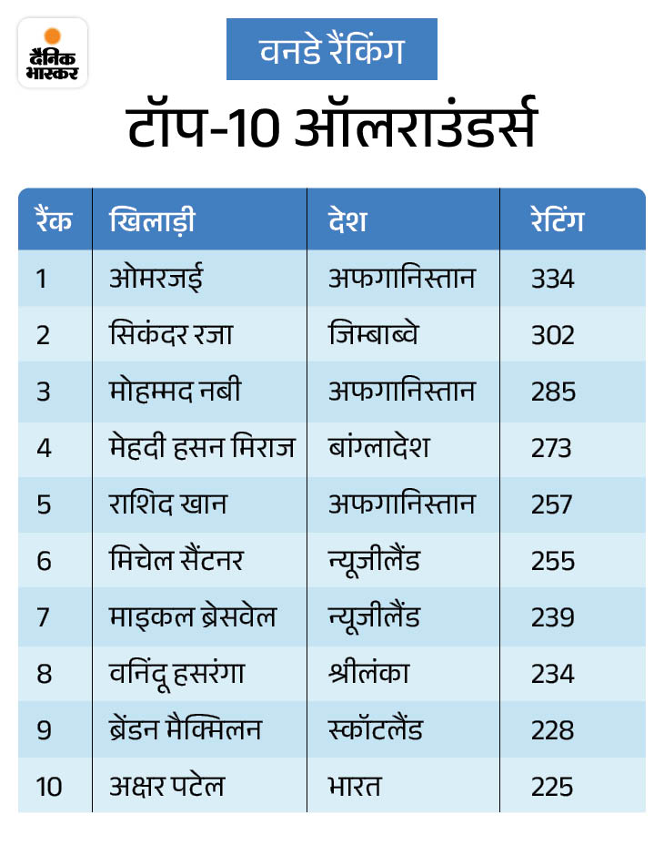 वनडे ऑलराउंडर्स रैंकिंग में भारत के अक्षर पटेल को एक स्थान का नुकसान हुआ। वे 10वें नंबर पर पहुंच गए। रवींद्र जडेजा 11वें नंबर पर कायम हैं। अफगानिस्तान के अजमतुल्लाह ओमरजई, जिम्बाब्वे के सिकंदर रजा और अफगानिस्तान के ही मोहम्मद नबी टॉप-3 में हैं।