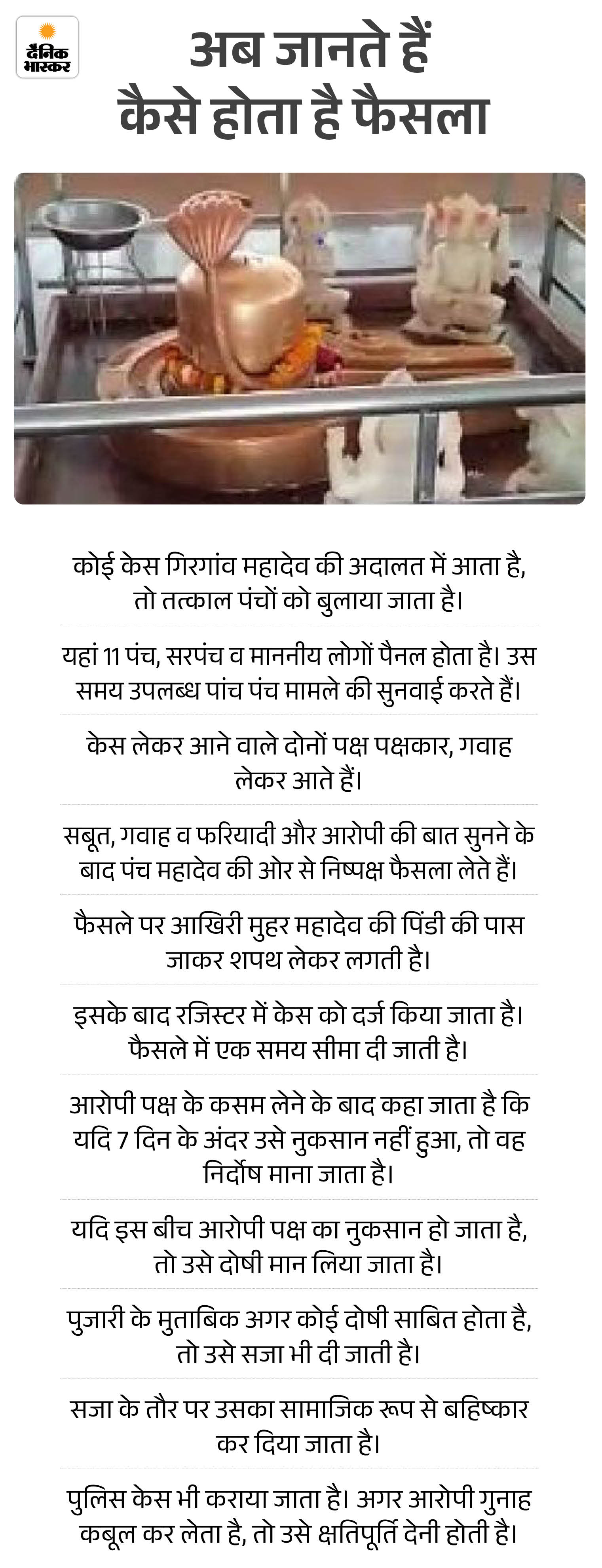 पंचों ने बताया कि यहां झूठी कसम खाने वालों को “सजा” मिलती है। साल 2022 का मिर्ची बाबा का केस सबसे चर्चित रहा। उन्होंने चंदे को लेकर विवाद में महादेव के सामने कसम खाई थी कि यदि चंदा लिया है, तो वे अगले दिन का सूरज नहीं देख पाएंगे। उसी रात क्राइम ब्रांच ने उन्हें रेप केस में गिरफ्तार कर लिया था। इस घटना को लोग महादेव की कसम के परिणाम के रूप में मानते हैं।