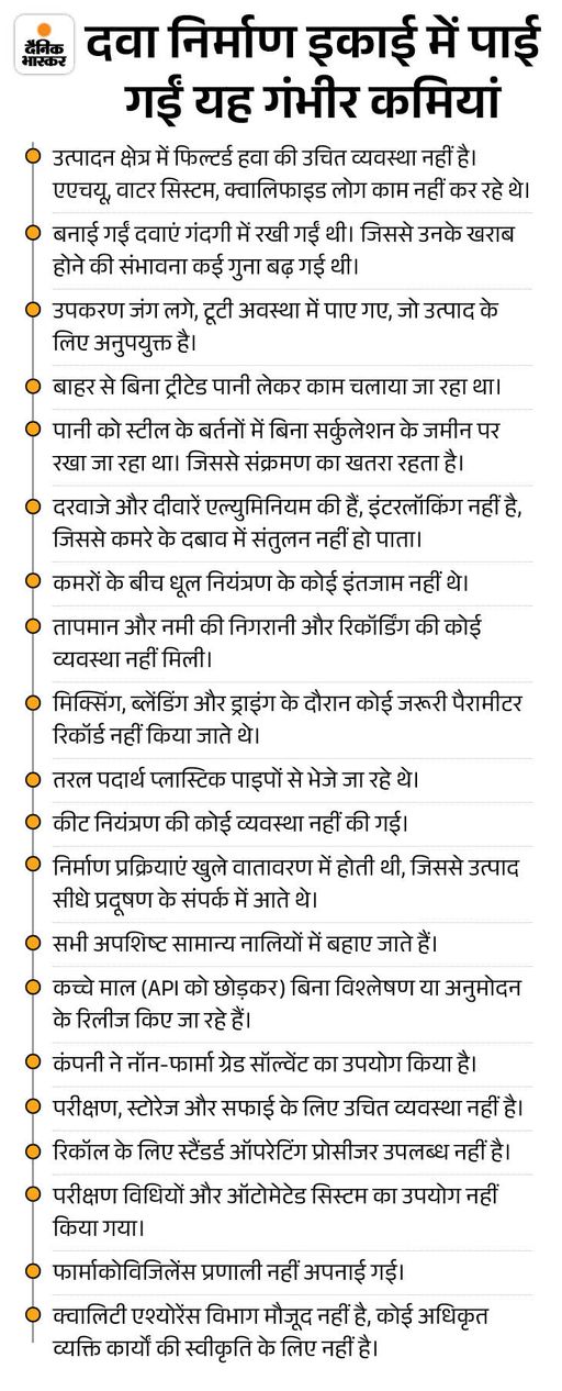 मध्य प्रदेश में 25 बच्चों की जान लेने वाले कोल्ड्रिफ कफ सिरप के मामले में हैरान करने वाला खुलासा हुआ है। परासिया सामुदायिक स्वास्थ्य केंद्र के डॉ. प्रवीण सोनी ने स्वीकार किया है कि कोल्ड्रिफ प्रिस्क्राइब करने की एवज में उन्हें श्रीसन फार्मास्युटिकल्स लिमिटेड से 10% कमीशन मिलता था। एक सिरप पर 89 रुपए एमआरपी दर्ज है। पूरी खबर पढ़ें