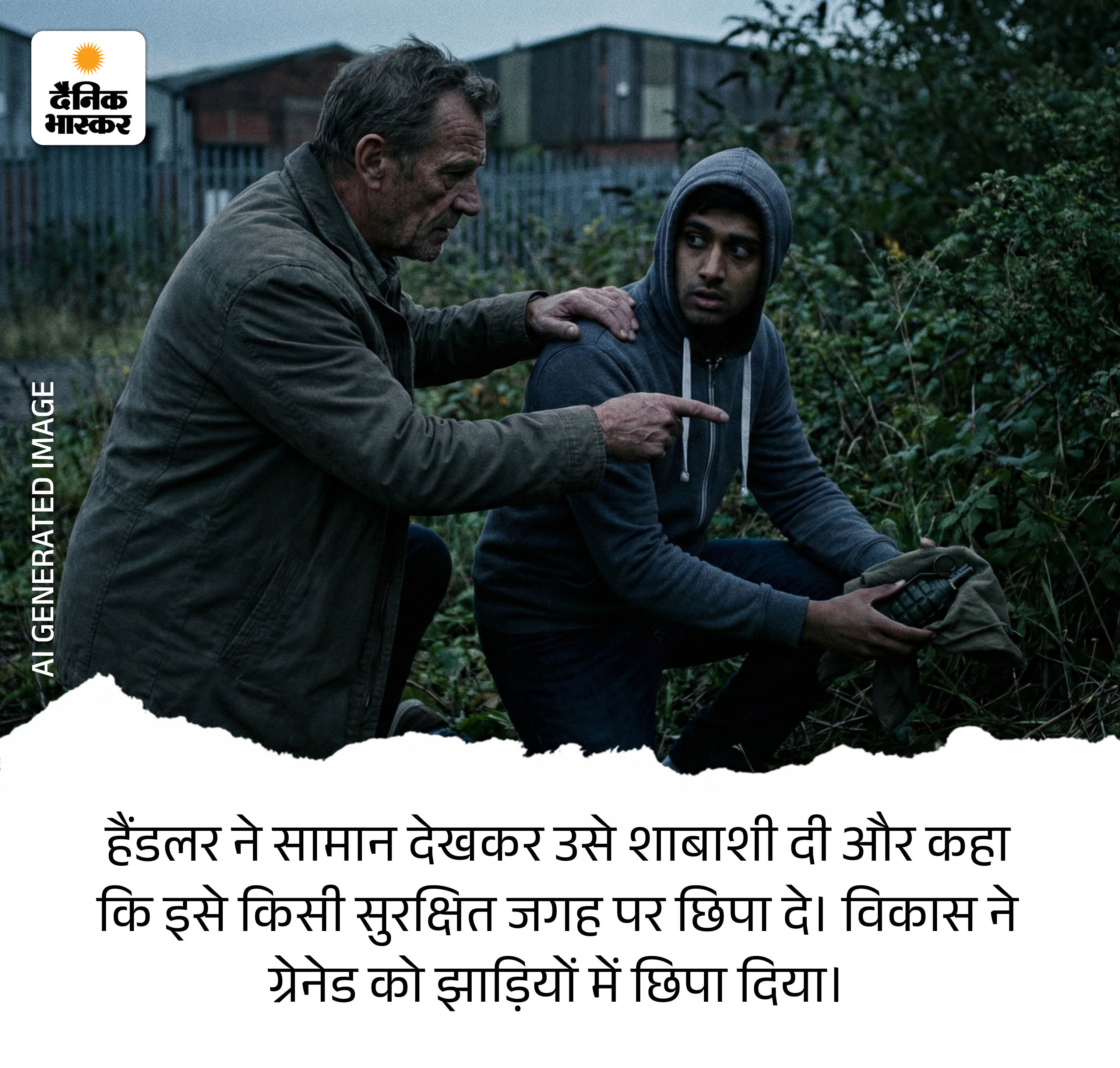 विकास बताई गई जगह पर एक बेंच पर इंतजार कर रहा था, तभी एक लड़का आया और उसे काली पॉलीथिन थमाकर चला गया। पॉलीथिन काफी भारी थी। विकास ने एक सुनसान जगह पर जाकर उसे खोला, तो उसके अंदर हैंडग्रेनेड था। यह देखकर वह एक पल के लिए डर गया, लेकिन फिर उसने हैंडलर को वीडियो कॉल किया।