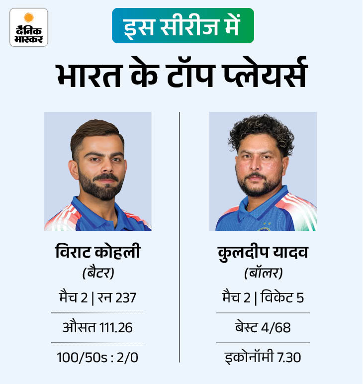 कोहली ने लगातार दो शतक लगाए भारत के पूर्व कप्तान विराट कोहली टीम के टॉप रन स्कोरर हैं, उन्होंने दोनों मुकाबलों में शतक लगाकर 237 रन बनाए हैं। दूसरे नंबर पर कप्तान केएल राहुल हैं। उन्होंने 126 रन बनाए हैं। वहीं कुलदीप यादव 5 विकेट लेकर टीम के टॉप गेंदबाज हैं।