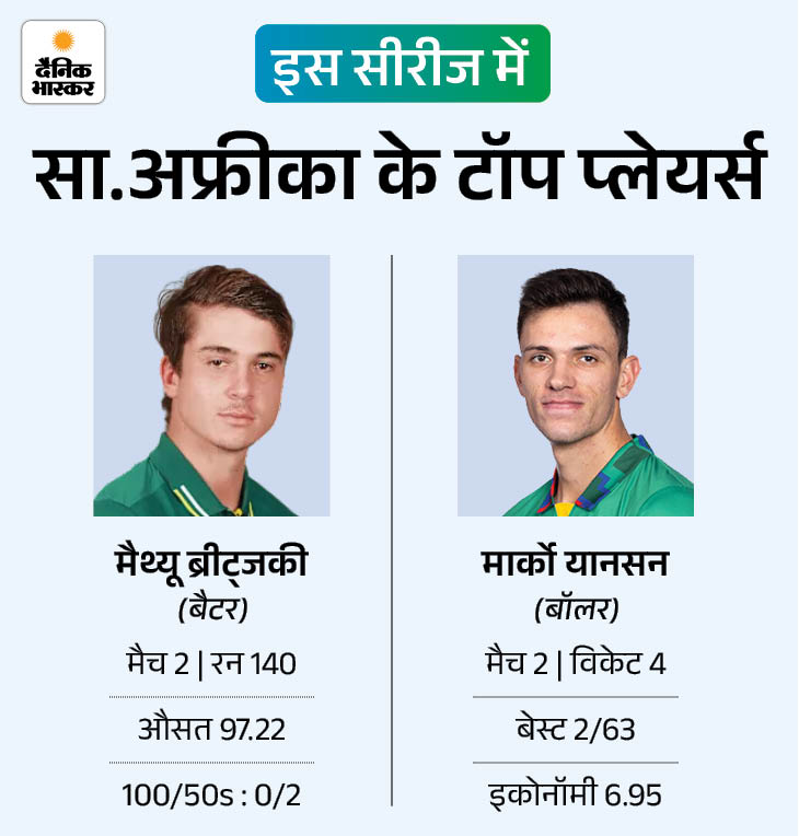 यानसन अफ्रीका के टॉप विकेट टेकर इस सीरीद में साउथ अफ्रीका के लिए मैथ्यू ब्रीट्जकी ने सबसे ज्यादा रन बनाए हैं। उन्होंने पहले दोनों मैचों में अर्धशतक लगाए। वहीं लेफ्ट आर्म फास्ट बॉलर मार्को यानसन ने टीम के लिए सबसे ज्यादा 4 विकेट लिए है।