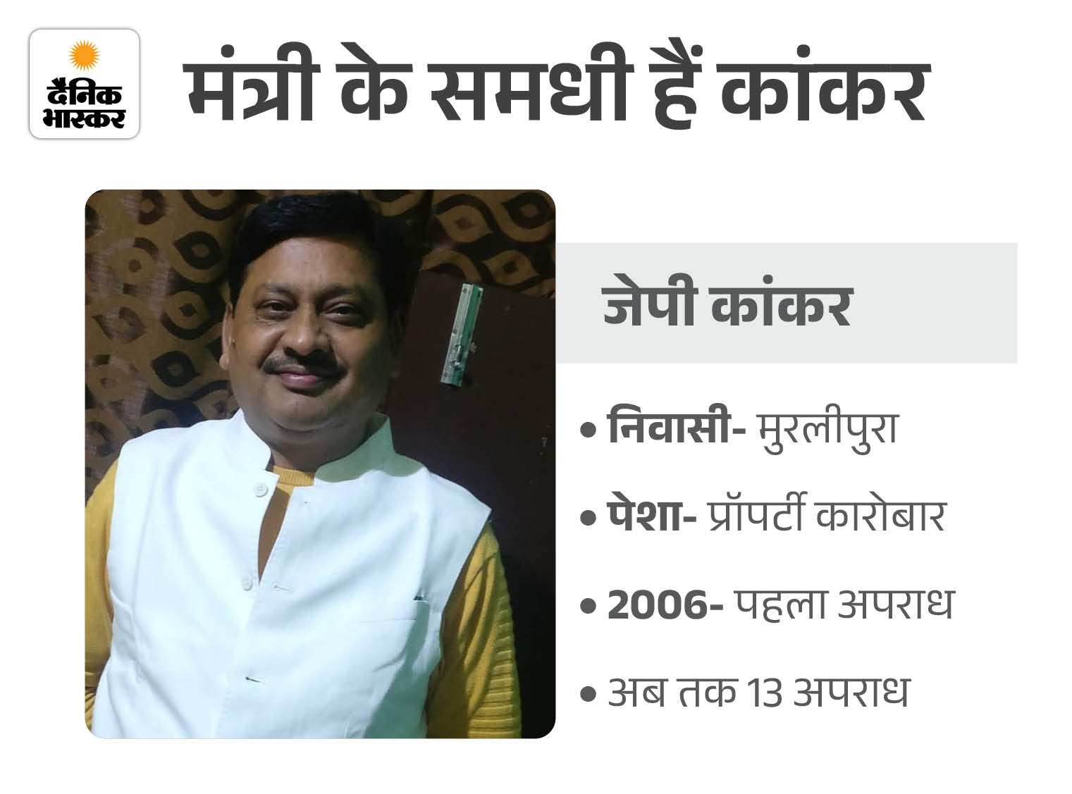 भास्कर टीम ने जब मंत्री के समधी जेपी कांकर निवासी मुरलीपुरा का आपराधिक रिकॉर्ड खंगाला तो चौंकाने वाला आंकड़ा सामने आया। कांकर पर अब तक 13 अपराध दर्ज हो चुके हैं। इनमें दो बार हत्या, हत्या का प्रयास, रासुका जैसे संगीन अपराध भी शामिल हैं। लोगों से बात की तो कोई भी कैमरे के सामने आने को तैयार नहीं हुआ, लेकिन दबी जुबान में कहा- मंत्री के समधी का रसूख अटेर क्षेत्र के मुरलीपुरा सहित आसपास की पंचायतों में खूब है। इसके अलावा भिंड शहर में भी जेपी कांकर की दबंगई से लोग भली-भांति परिचित हैं।