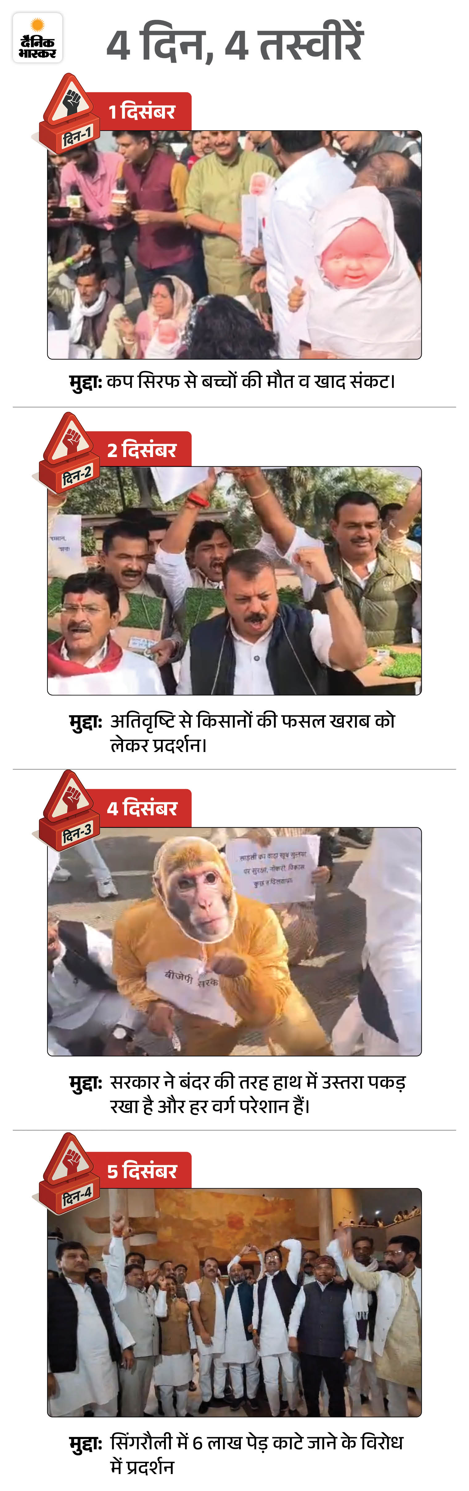 - पहला दिन (पूतना का भेष): कफ सिरप से बच्चों की मौत के मामले पर महिला विधायक सेना पटेल ‘पूतना’ का भेष धरकर और गले में कफ सिरप की माला पहनकर पहुंचीं।