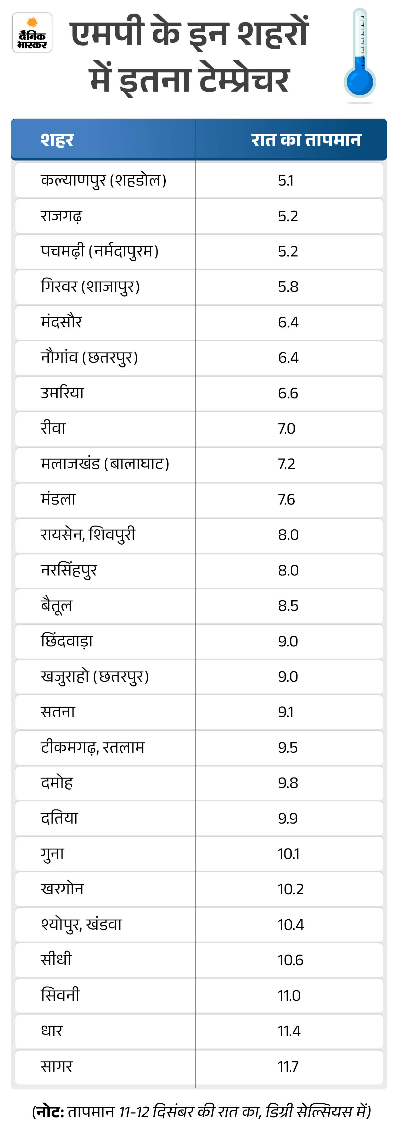 मौसम विभाग के अनुसार, बीती रात अधिकांश शहरों में तापमान 10 डिग्री से नीचे ही रहा। राजगढ़ में 5.2 डिग्री, नौगांव में 6.4 डिग्री, उमरिया में 6.6 डिग्री, रीवा में 7 डिग्री, मलाजखंड में 7.2 डिग्री, मंडला में 7.6 डिग्री, रायसेन, शिवपुरी-नरसिंहपुर में 8 डिग्री, बैतूल में 8.5 डिग्री, छिंदवाड़ा-खजुराहो में 9 डिग्री, सतना में 9.1 डिग्री, टीकमगढ़-रतलाम में 9.5 डिग्री, दमोह में 9.8 डिग्री और दतिया में 9.9 डिग्री सेल्सियस रहा।