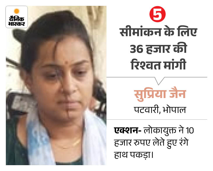 सीमांकन का रेट था 2 हजार रुपए प्रति एकड़ भोपाल में लोकायुक्त पुलिस ने पटवारी सुप्रिया जैन को एक किसान से जमीन के सीमांकन के बदले में 10 हजार रुपए की रिश्वत लेते हुए पकड़ा था। हुजूर तहसील के पटवारी हलका नंबर 40 में पदस्थ सुप्रिया जैन ने जमीन के सीमांकन के बदले प्रति एकड़ 36000 रुपए की मांग की थी। मुबारकपुर के रहने वाले मोहम्मद असलम ने अपनी 18 एकड़ जमीन के सीमांकन के लिए आवेदन दिया था।