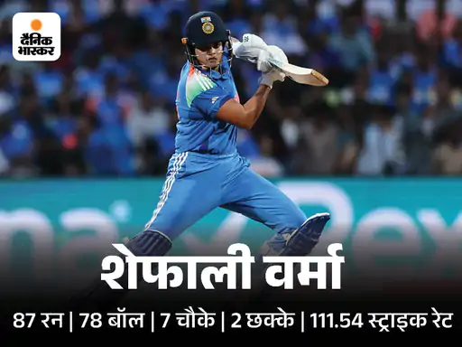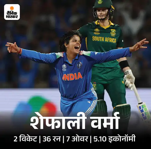 भारत को पहला विमेंस वर्ल्ड कप दिलाने में अहम भूमिका निभाने वाली शेफाली वर्मा को ICC विमेंस प्लेयर ऑफ द मंथ चुना गया है। नवी मुंबई में खेले गए फाइनल में उन्होंने साउथ अफ्रीका के खिलाफ 78 गेंदों पर 87 रन की शानदार पारी खेली थी। यह विमेंस वर्ल्ड कप फाइनल में किसी भी भारतीय ओपनर का सबसे बड़ा स्कोर रहा।