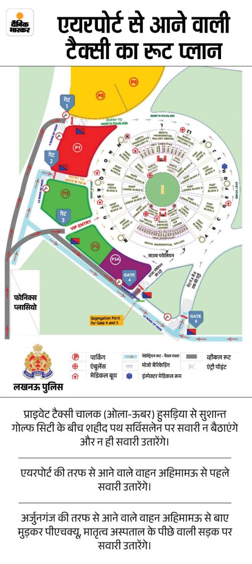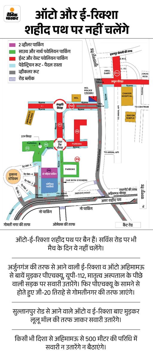 मैच के कारण शाम 5 बजे से रात 12 बजे तक एक वक्त में शहीद पथ पर 1400 से 2100 के बीच वाहनों का दबाव रहने की संभावना है। दर्शकों के अतिरिक्त कानपुर नगर, एक्सप्रेस-वे, बाराबिरवा, अमौसी की तरफ जाने वाले सारे वाहन चालक भीड़ में फंसने से बचने के लिए शहीद पथ का इस्तेमाल करने से बचें। डायवर्जन वाले रास्तों का इस्तेमाल करें।
