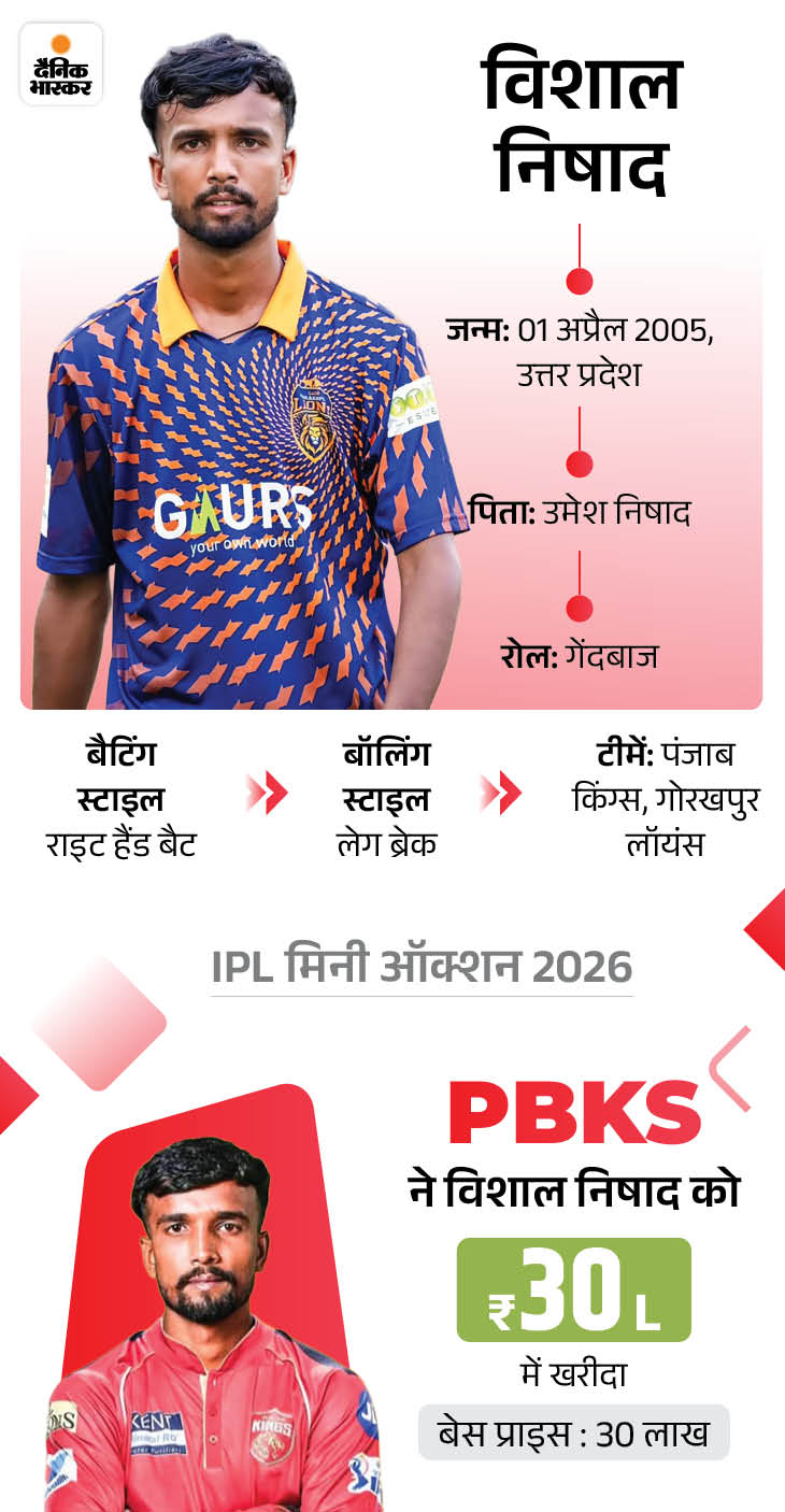 उत्तर प्रदेश के गोरखपुर से आने वाले 22 साल के स्पिनर विशाल निषाद को IPL ऑक्शन में पंजाब किंग्स ने 30 लाख रुपए में अपनी टीम में शामिल किया है। कभी पिता के साथ मजदूरी कर परिवार चलाने वाले विशाल की इस कामयाबी के पीछे उनके कोच कल्याण सिंह की अहम भूमिका रही।