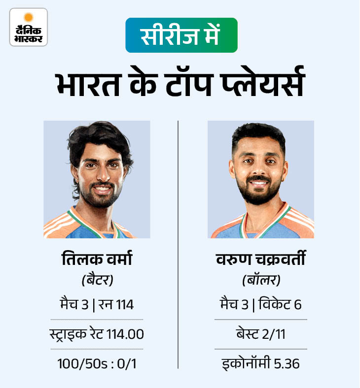 तिलक वर्मा ने एक फिफ्टी लगाई इस सीरीज में भारत की ओर से तिलक वर्मा सबसे सफल बल्लेबाज रहे हैं। उन्होंने 3 मैचों में 114 रन बनाए हैं और स्ट्राइक रेट 114.00 का रहा है। इस दौरान तिलक ने एक अर्धशतक भी लगाया है। गेंदबाजी में वरुण चक्रवर्ती ने शानदार प्रदर्शन किया है। उन्होंने 3 मैचों में 6 विकेट झटके हैं।