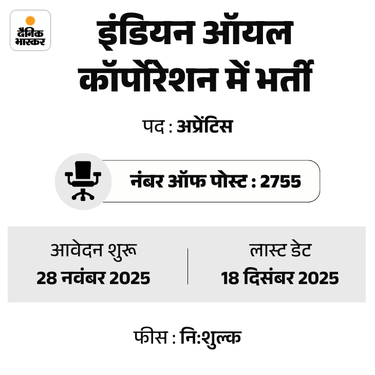 इंडियन ऑयल कॉर्पोरेशन लिमिटेड (IOCL) ने अप्रेंटिस के 2,755 पदों पर भर्ती निकाली है। इस भर्ती के लिए आवेदन का आज यानी 18 दिसंबर, 2025 को आखिरी दिन है।