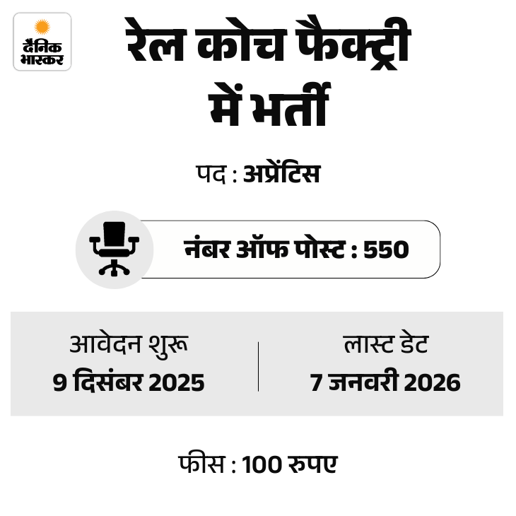 रेल कोच फैक्ट्री, कपूरथला ने अप्रेंटिस के 550 पदों पर भर्ती निकाली है। उम्मीदवार ऑफिशियल वेबसाइट rcf.indianrailways.gov.in के जरिए ऑनलाइन आवेदन कर सकते हैं।