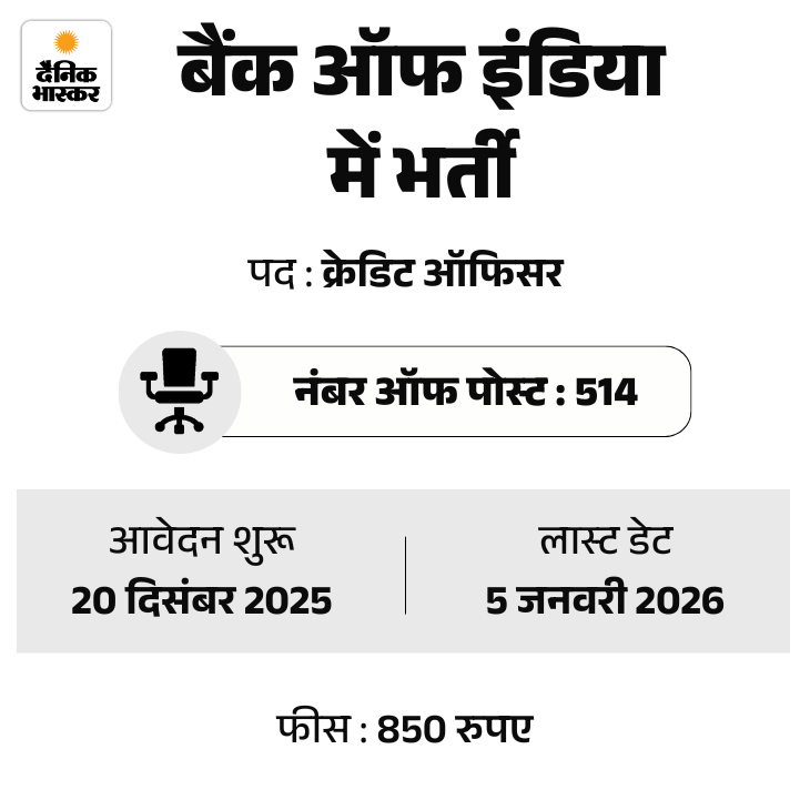 बैंक ऑफ इंडिया ने 514 क्रेडिट ऑफिसर के पदों पर भर्ती का नोटिफिकेशन जारी किया है। उम्मीदवार ऑफिशियल वेबसाइट bankofindia.bank.in के माध्यम से ऑनलाइन आवेदन कर सकते हैं।
