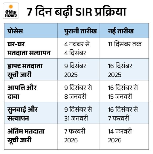 खास बात यह है कि एमपी में एसआईआर की अवधि सात-सात दिन के लिए दो बार बढ़ाई गई है। पहले एसआईआर का काम 4 दिसबंर तक पूरा करने के लिए कहा गया था, जिसे पहली बार 11 दिसम्बर के लिए बढ़ाया गया और फिर दोबारा भी इसमें सात दिन की वृद्धि की गई।