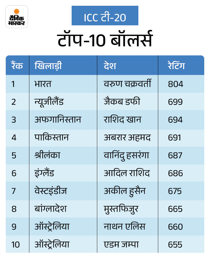 वरुण नंबर-1 पर कायम टी-20 बॉलर्स रैंकिंग में भारत के वरुण चक्रवर्ती ने अपनी टॉप पोजिशन और मजबूत कर ली है। साउथ अफ्रीका के खिलाफ सीरीज में वे सबसे ज्यादा विकेट लेने वाले गेंदबाज रहे और कुल 10 विकेट झटके। इसमें आखिरी टी-20 मैच में लिए गए 4 विकेट भी शामिल हैं। शानदार प्रदर्शन का असर रैंकिंग में साफ दिखा, जहां वरुण के 804 रेटिंग पॉइंट्स हैं। वे दूसरे नंबर पर मौजूद न्यूजीलैंड के जैकब डफी (699) से काफी आगे बने हुए हैं।