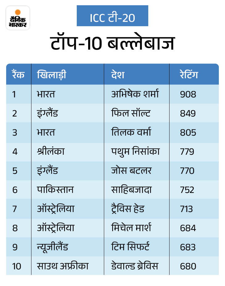 अभिषेक शर्मा टॉप पर टी-20 बैटर्स रैंकिंग में अभिषेक शर्मा नंबर-1 पर काबिज हैं। इंग्लैंड के ओपनर फिल सॉल्ट दूसरे स्थान पर बने हुए हैं। वहीं 805 रेटिंग पॉइंट्स के साथ तिलक वर्मा तीसरे पायदान पर पहुंच गए हैं।